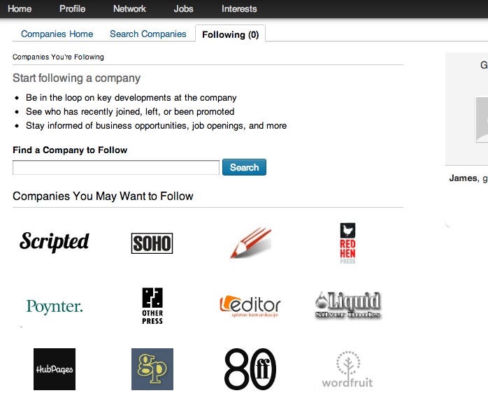 The Company section of the site, listed in the interests tab allows you to view profile pages for businesses or create your own. Note that if you want to add your own Company page you need to have your own domain name and company email address, otherwise LinkedIn will not accept your request for a Company page.